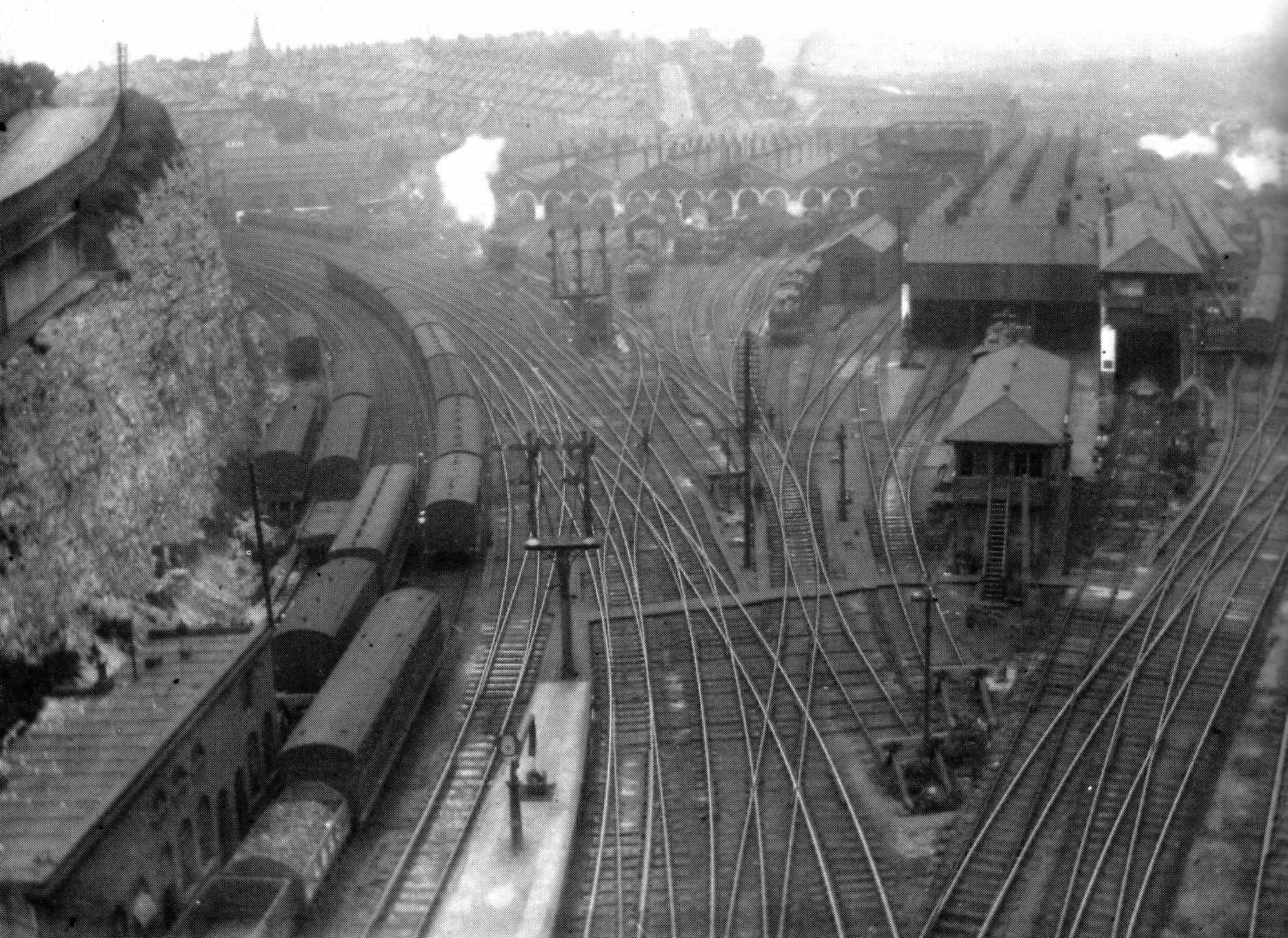 ABOVE: A birds-eye view from the top of the station roof showing the end of Platforms 1 & 2, the MPD and New Shed, West and South Signal Boxes. The West Coast Line is on the left. This picture was taken in 1924; the signal boxes were closed 9 years later. Photo is owned by Ian Allen Publishing.