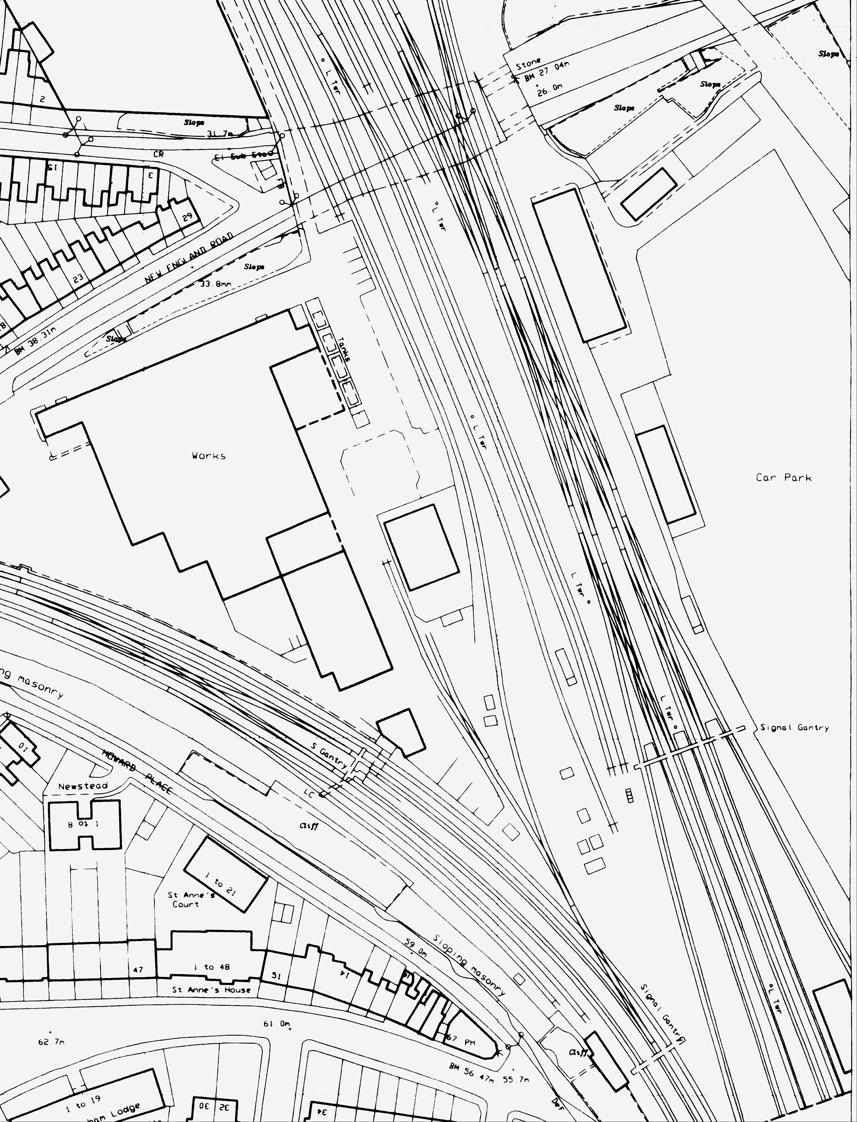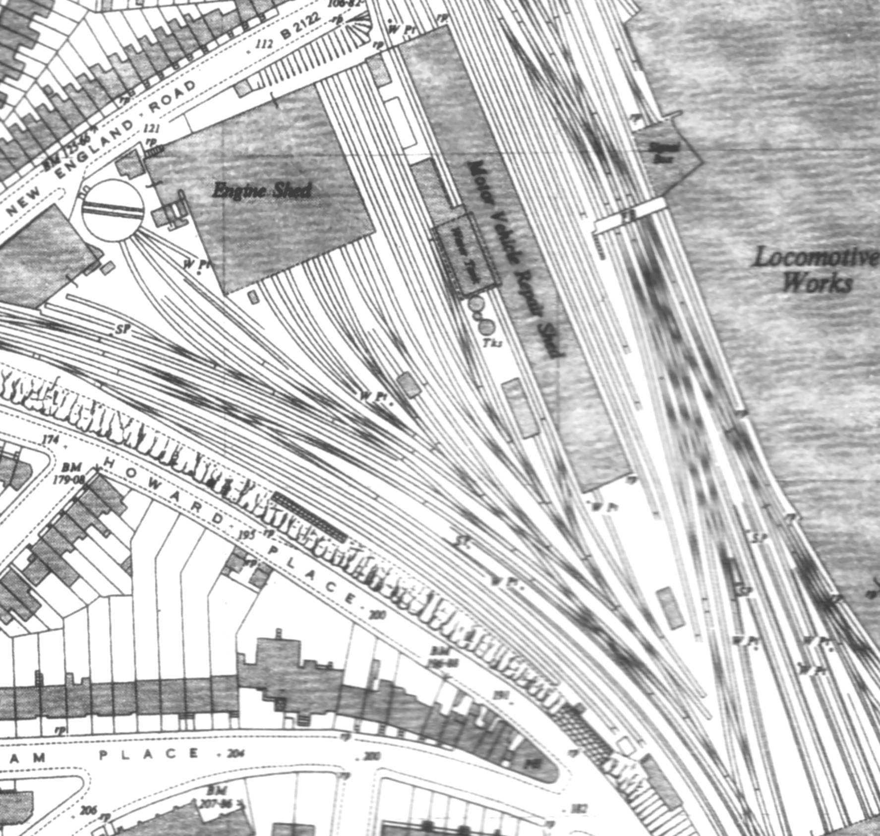 ABOVE: This map shows the Combined Engineering Works on the site of the old Steam Sheds (which were seen in the preceding map). It is interesting to note the bridge over New England Road. While the structure was widened to accept more track work, no lines actually pass over the original bridge: two buildings and the northwesterly tip of the carpark are directly in the path of any route that would have crossed the bridge. In the top right corner of the map, the bridge to the Lower Goods Yard can still be seen still intact at the present day (2013). Map owned by Ordinance Survey Publications (subsequent revisions have occured)