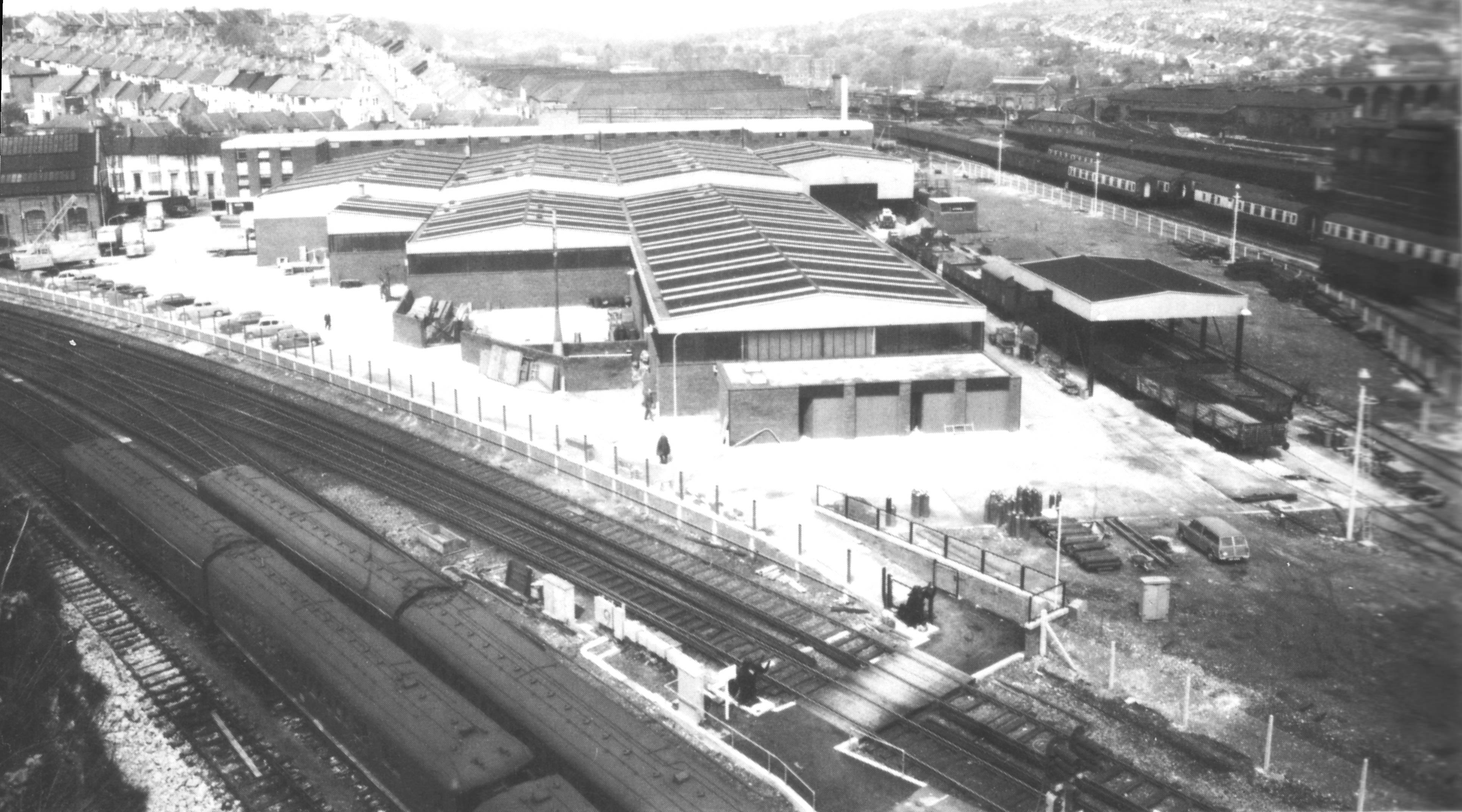 The MPD (above) shown in 1960. The large building at the top of the picture still remains today as a carriage shed. The roof of the MPD (foreground) was originally pitched in the opposite direction and access was gained through 10 arches, one of which still exists on the left of the frontage.
