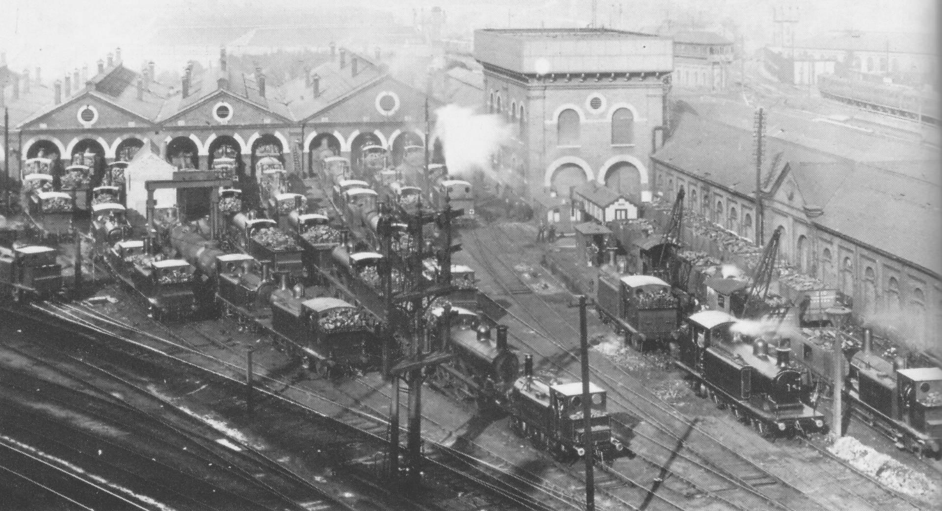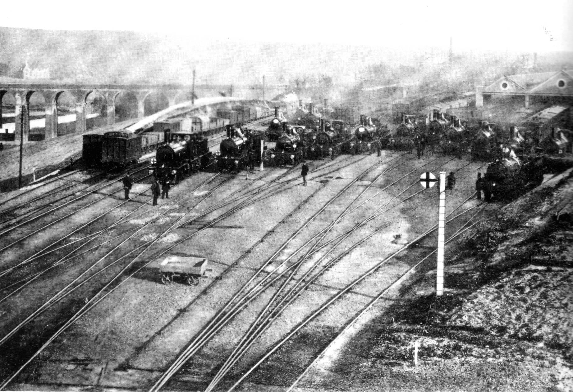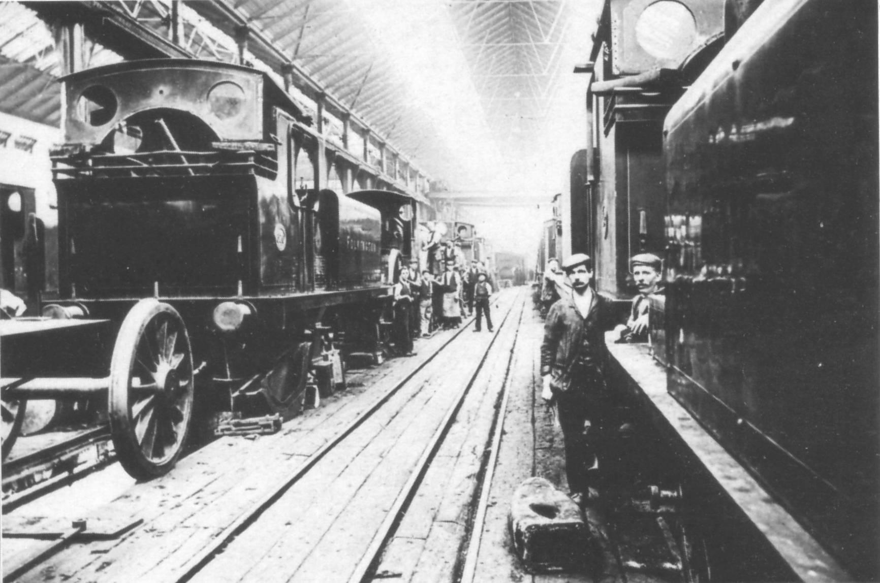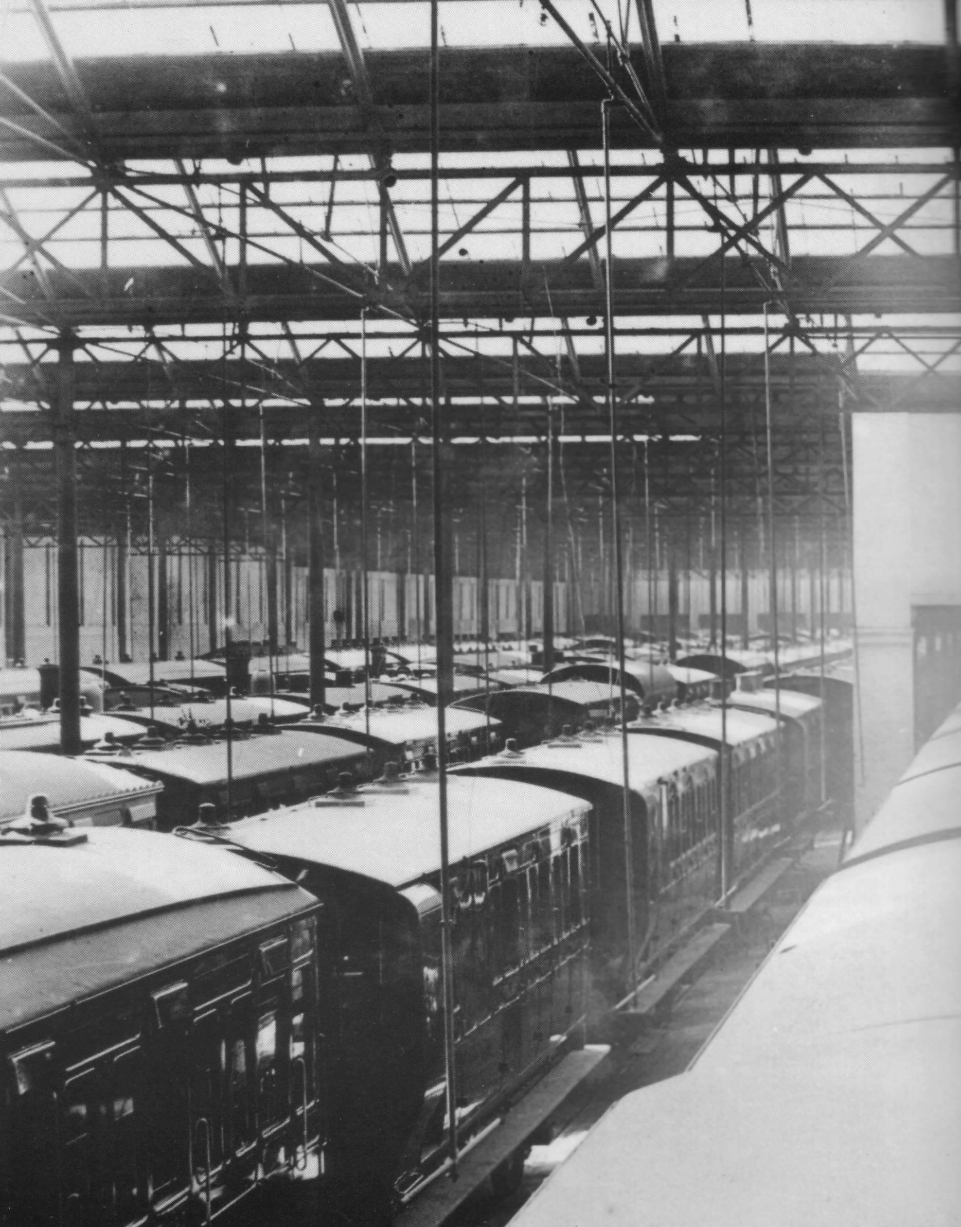 The roads entered the shed at the station end and emerged at the country end, continuing to connect with the main lines into the station. Locomotives that were ready for service were parked on these tracks until the time came for them to be connected to their trains. They were arranged on these tracks in order of their departure and were despatched one after the other to run forward over the points and then back onto their coaches in the main line platforms.