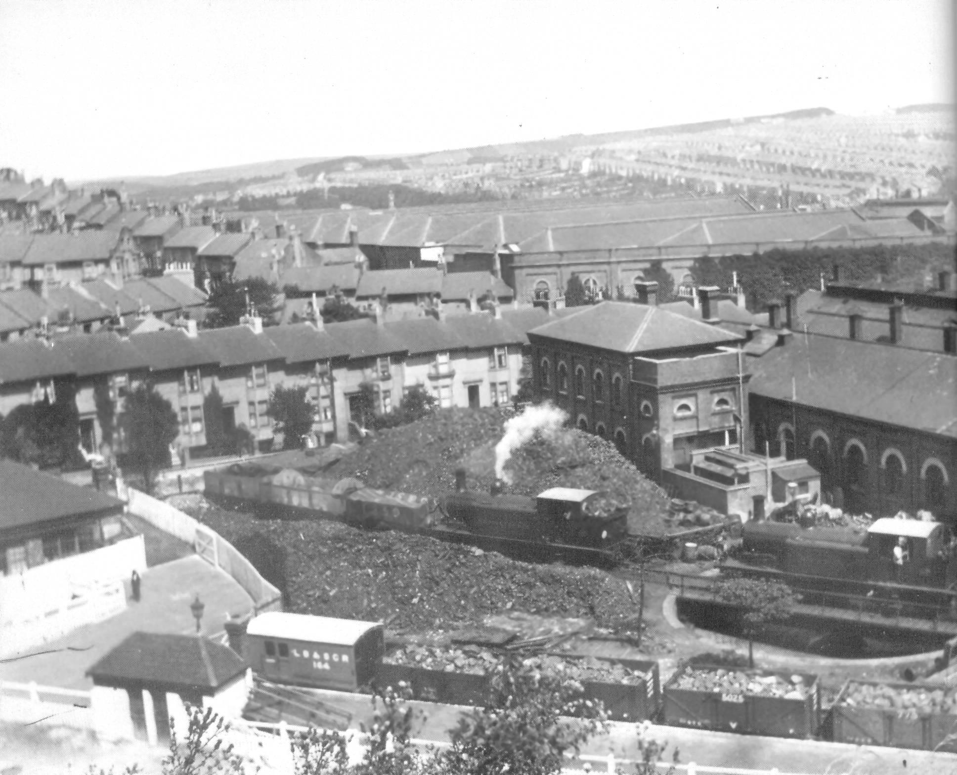 ABOVE: Overlooking the West Coast Line we can see the side of the MPD and part of the coal store and turntable. Note the frontage of the houses in New England Street: their view has changed completely as a new combined engineering building now occupies this spot.