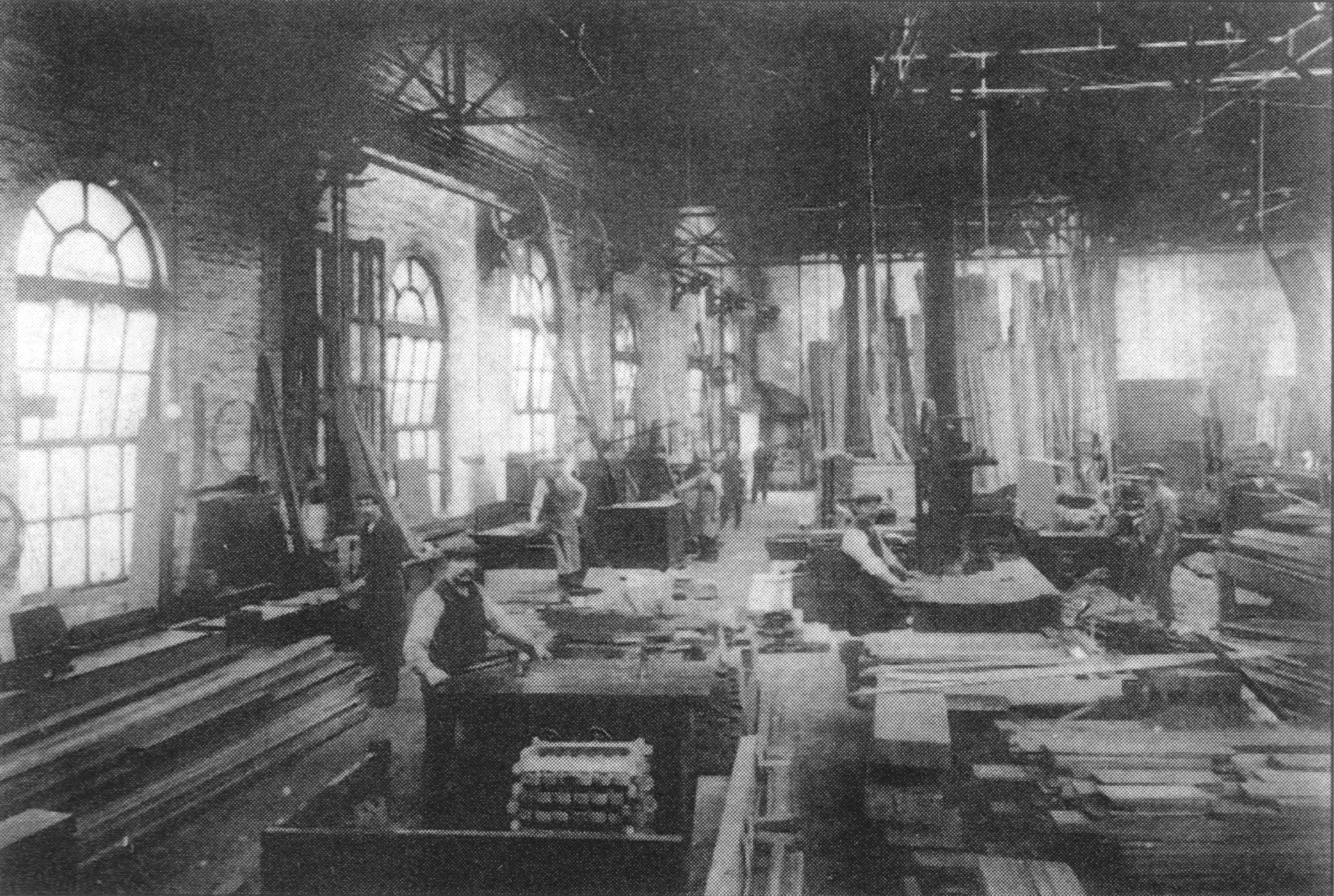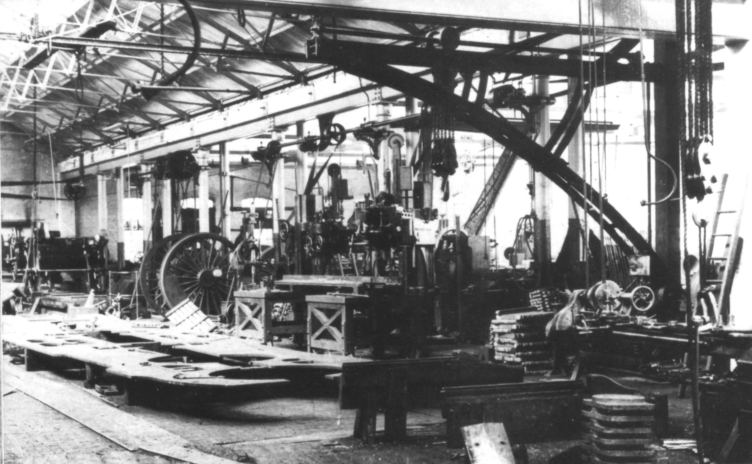 ABOVE: This photo shows the interior of the Wheel Shop. Note that belts drive the machinery from the overhead line shaft. A stationary engine drove these on site. Image owned by The Madgewick Collection / Ian Allen Publishing.