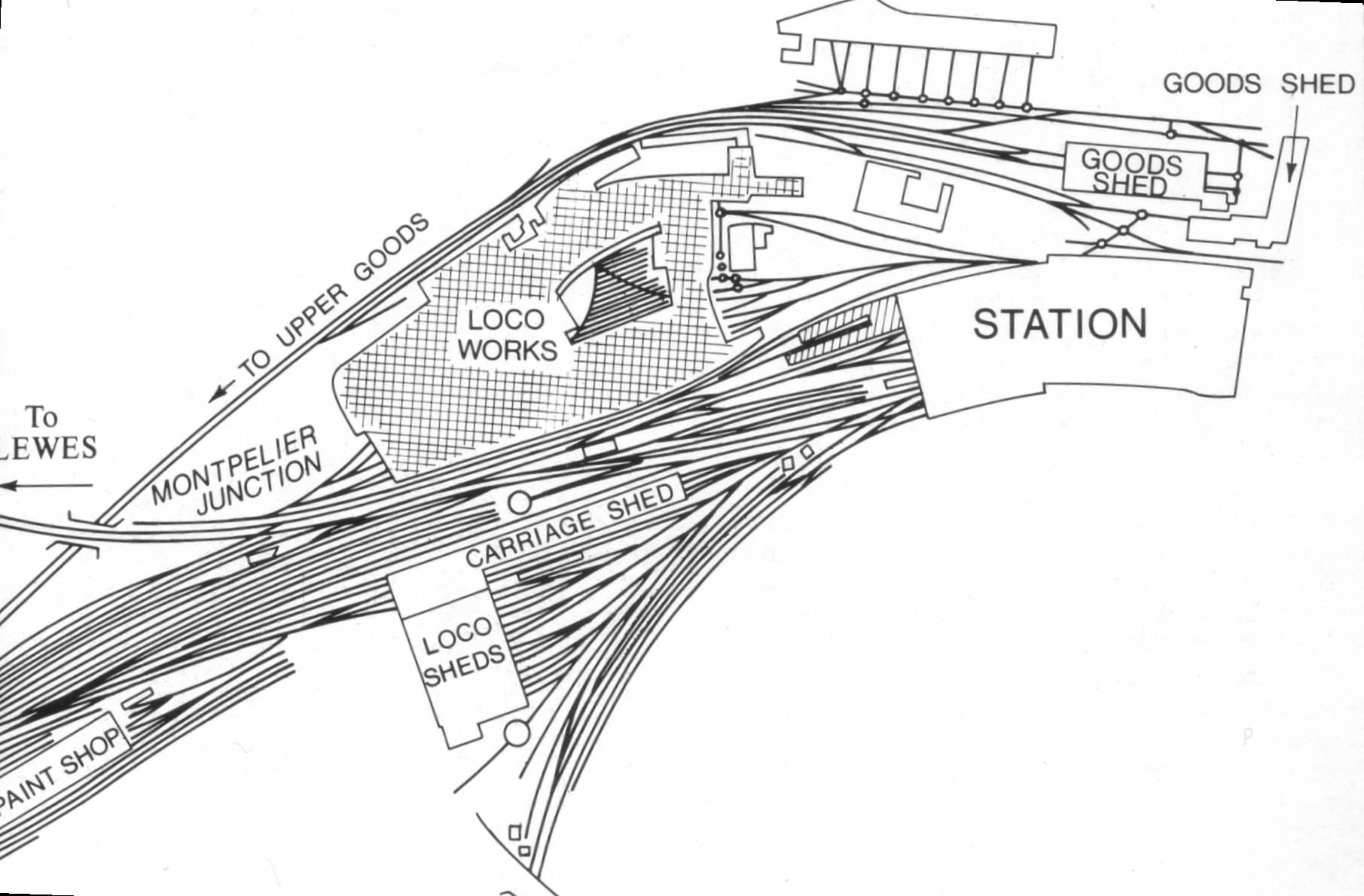 ABOVE: This picture shows the main shed and the New Shed, in the triangle bound by the West Coast Line, The London Main Line & New England Street. The West Coast Line sweeps round towards Hove at the bottom left corner. The Montpelier Signal Box can just about been seen to the top right of the water tower. Note the 2 steam cranes used for coaling the trains.