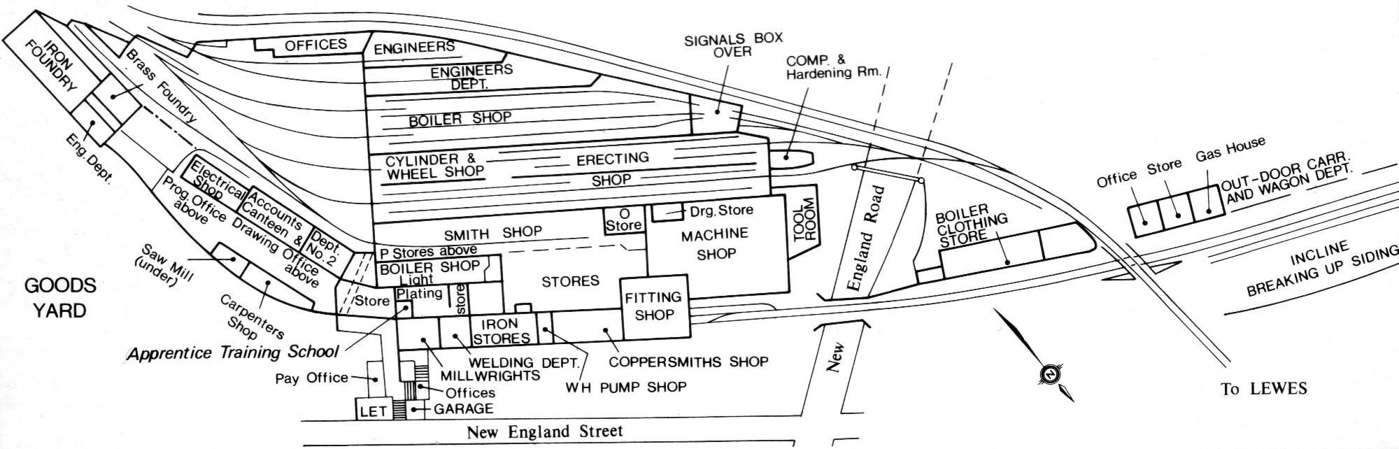 A separate group of buildings had been constructed just North of New England Road and included Offices, a Gas House and The Boiler Clothing Store. Mr. Billinton Jnr. was responsible for a fleet of 610 locomotives.